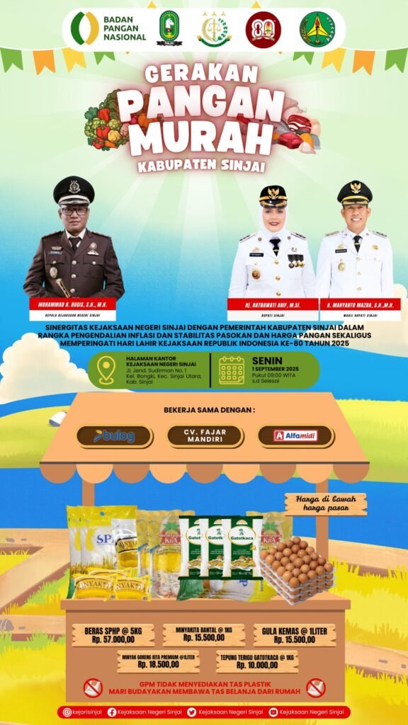 SINJAI, INSERTRAKYAT.COM — Dalam rangka memperingati Hari Lahir Kejaksaan Republik Indonesia ke-80, Kejaksaan Negeri (Kejari) Sinjai bersama Pemerintah Kabupaten Sinjai akan menggelar Gerakan Pangan Murah (GPM) pada Senin, 1 September 2025, mulai pukul 09:00 WITA di pelataran parkir Kantor Kejari Sinjai, Jalan Jenderal Sudirman, Kelurahan Biringere, Kecamatan Sinjai Utara. Kegiatan ini terbuka untuk umum.