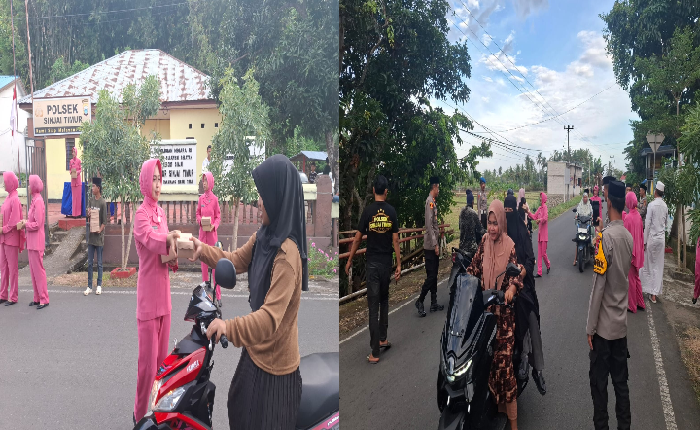 Takjil dibagikan kepada pengendara sepeda motor dan mobil yang melintas di depan Mako Polsek sebagai bentuk kepedulian terhadap warga yang tengah menjalankan ibadah puasa.
