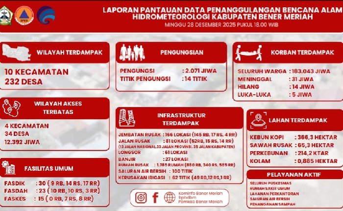 BENNER MERIAH, INSERTRAKYAT.com — Bencana banjir dan longsor yang melanda Kabupaten Bener Meriah, Provinsi Aceh berdampak luas pada 10 kecamatan dan 232 desa. Berdasarkan data Posko Tanggap Darurat Aceh per 28 Desember 2025 pukul 18.00 WIB, total sebanyak 183.043 jiwa tercatat terdampak akibat bencana tersebut.