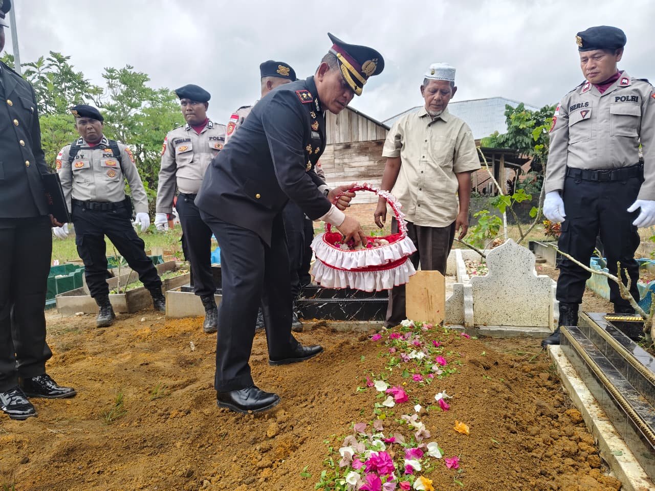 Upacara pemakaman tersebut dipimpin oleh Wakapolres Aceh Timur Kompol Abdu Muin, S.H.,M.M. yang dilaksanakan di pemakaman umum Desa Paya Bujok Seuleumak, Kecamatan Langsa Baro, Kota Langsa. Kamis, (19/02/2026).