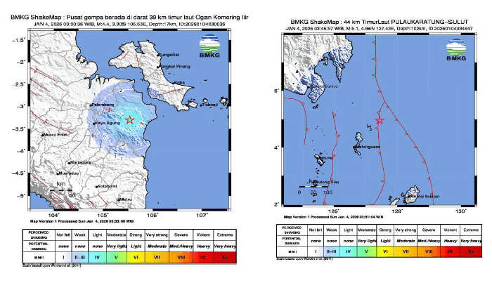 DUA peristiwa gempa bumi terjadi pada Sabtu, 4 Januari 2026, dalam rentang waktu kurang dari satu jam, mengguncang wilayah Sumatera Selatan dan Sulawesi Utara.