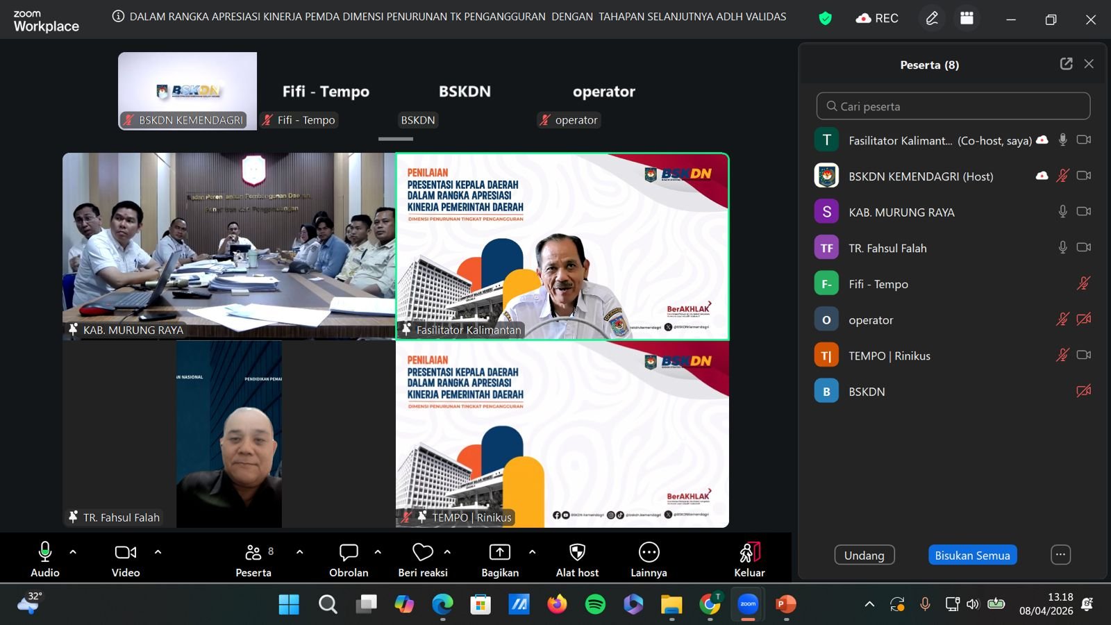 Bontang, InsertRakyat.com– BSKDN Kemendagri melaksanakan validasi apresiasi kinerja Pemkot Bontang terkait penurunan pengangguran, secara daring pada 8 April 2026.