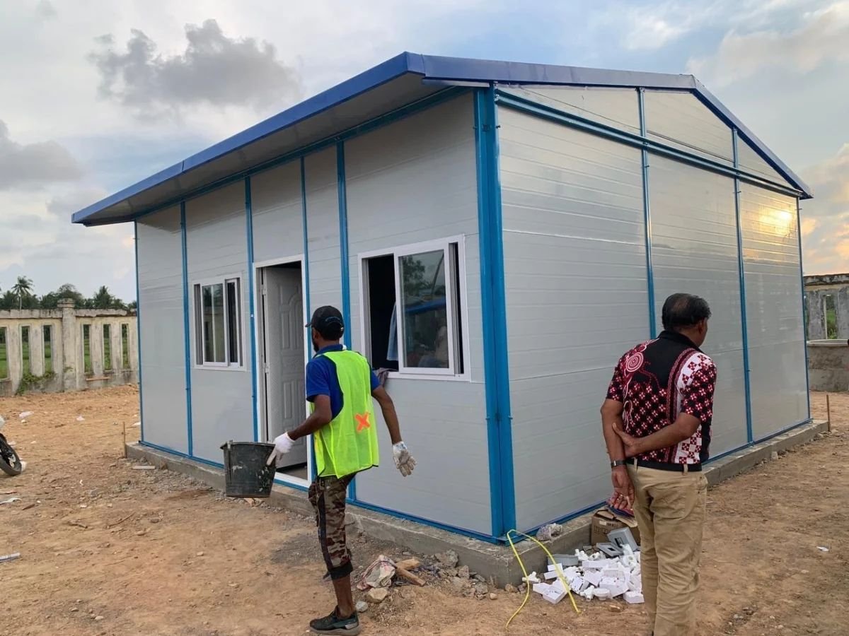 Rumah juga dibangun dengan sistem knock down, yaitu metode konstruksi cepat yang memungkinkan rumah dirakit secara lebih efisien di lokasi pembangunan. Setiap unit hunian dilengkapi dengan fasilitas dasar seperti dua kasur, meja makan, kursi, televisi, serta kamar mandi dengan perlengkapan lengkap.