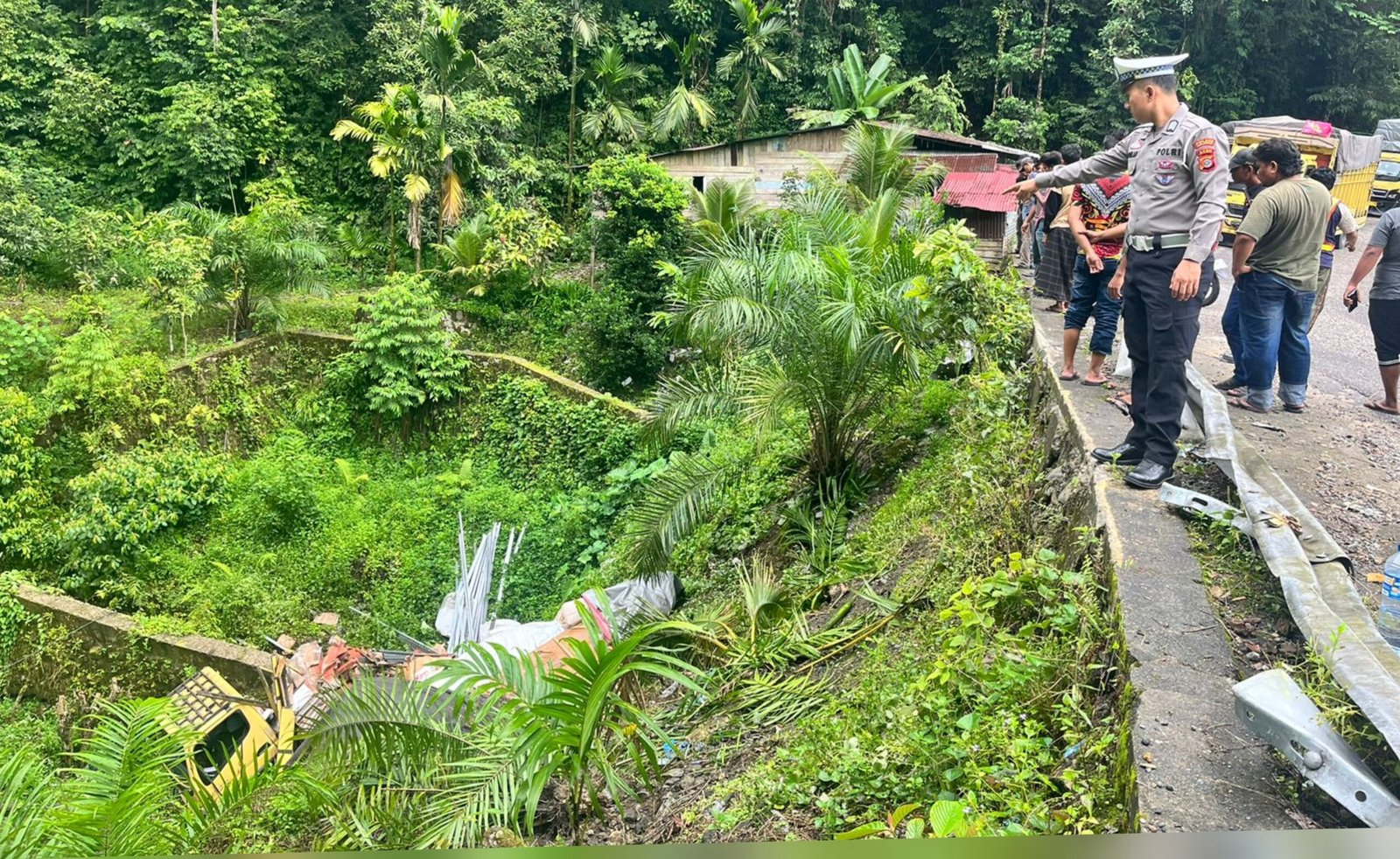 Subulussalam – Sat Lantas Polres Subulussalam tiba di lokasi kejadian kecelakaan lalulintas mobil barang Mitsubishi Colt Diesel dengan berlatih nomor kendaraan BL 8662 C, kecelakaan tunggal jatuh dan masuk jurang di Jalan Teuku Umar Desa Jontor Kecamatan Penanggalan Kota Subulusaalam. Minggu, 19 Oktober 2025.