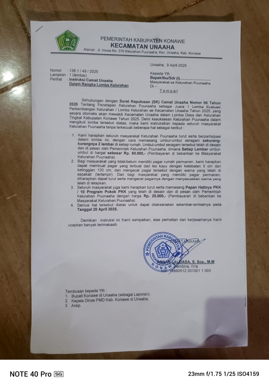 Menanggapi isu tersebut, Camat Unaaha, Asran Laloasa, S.Sos., M.M., menyampaikan klarifikasi tertulis pada pukul 14.21 WITA. Ia menegaskan bahwa pengadaan atribut seperti umbul-umbul dan baliho merupakan bentuk partisipasi masyarakat dalam Lomba Kelurahan yang dilaksanakan serentak se-Indonesia, sesuai dengan Permendagri Nomor 81 Tahun 2015.