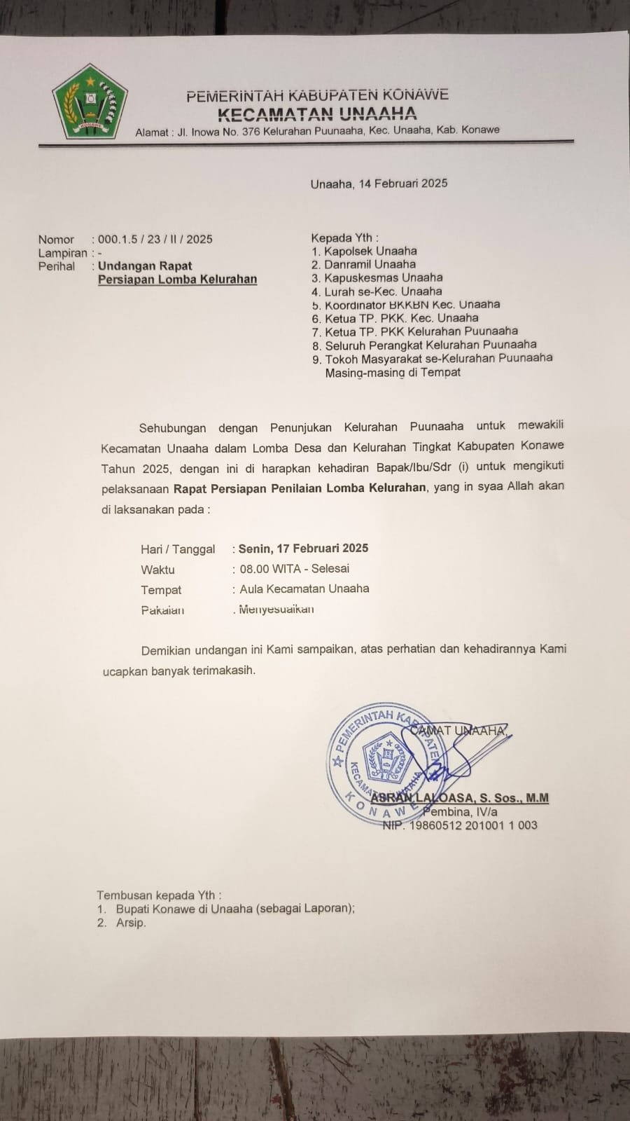 Camat Unaaha berharap masyarakat dapat menyambut Lomba Kelurahan sebagai ajang positif untuk membawa nama baik daerah. Ia menegaskan bahwa lembaga kecamatan terbuka terhadap setiap masukan, namun menolak keras penyebaran informasi yang belum terverifikasi. “Untuk puncak acara lomba besok (Rabu) berlangsung,” tegasnya.