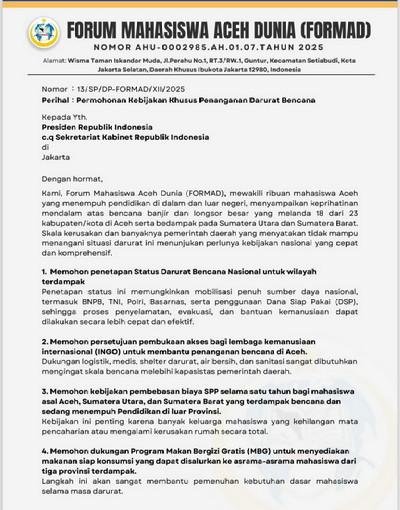 JAKARTA, INSERTRAKYAT.COM — Forum Mahasiswa Aceh Dunia (FORMAD) mendesak Presiden Prabowo Subianto menetapkan status darurat bencana nasional setelah banjir dan longsor besar melanda 18 dari 23 kabupaten/kota di Aceh serta berdampak hingga Sumatera Utara dan Sumatera Barat.