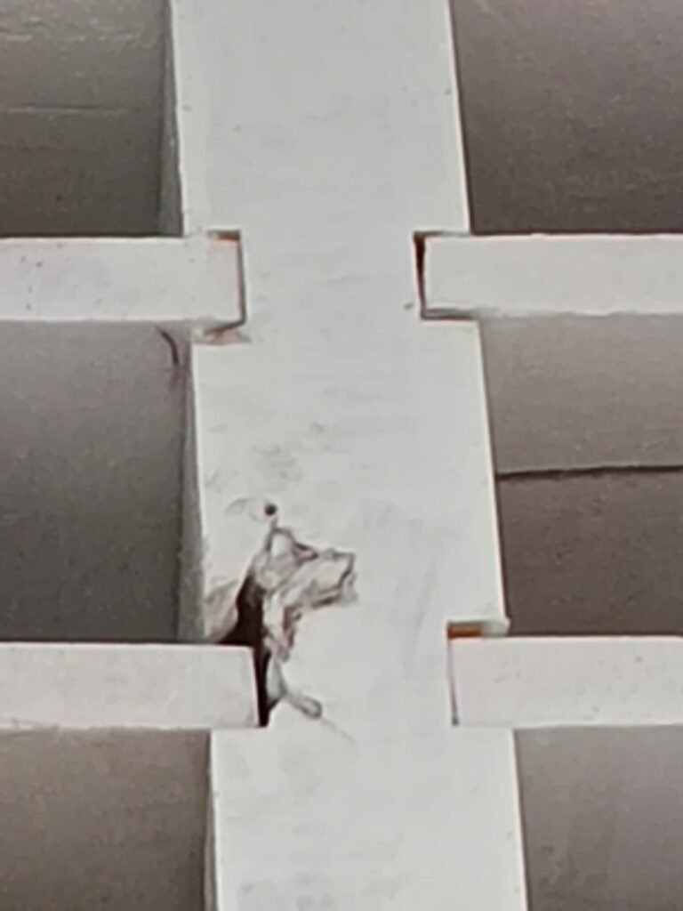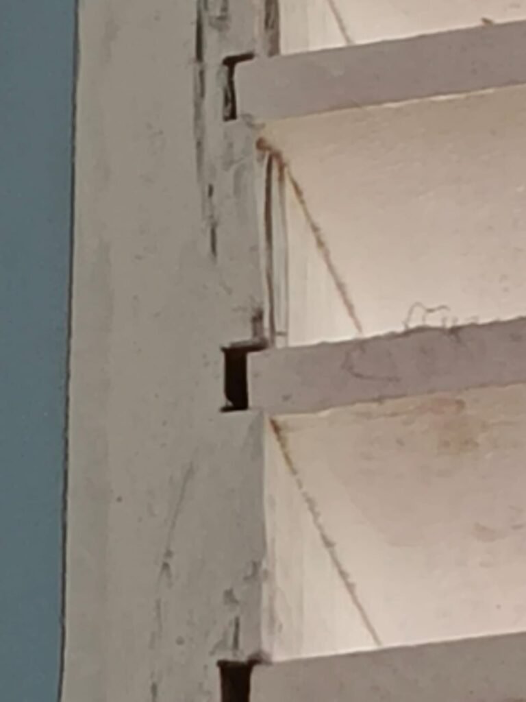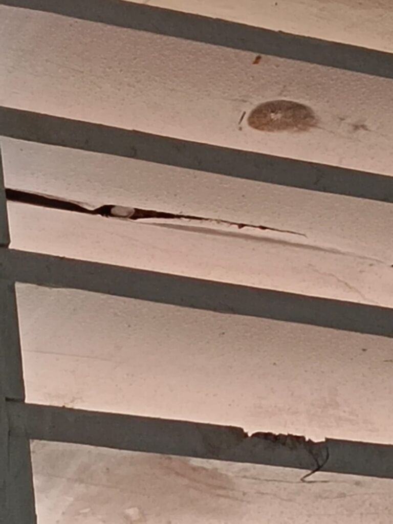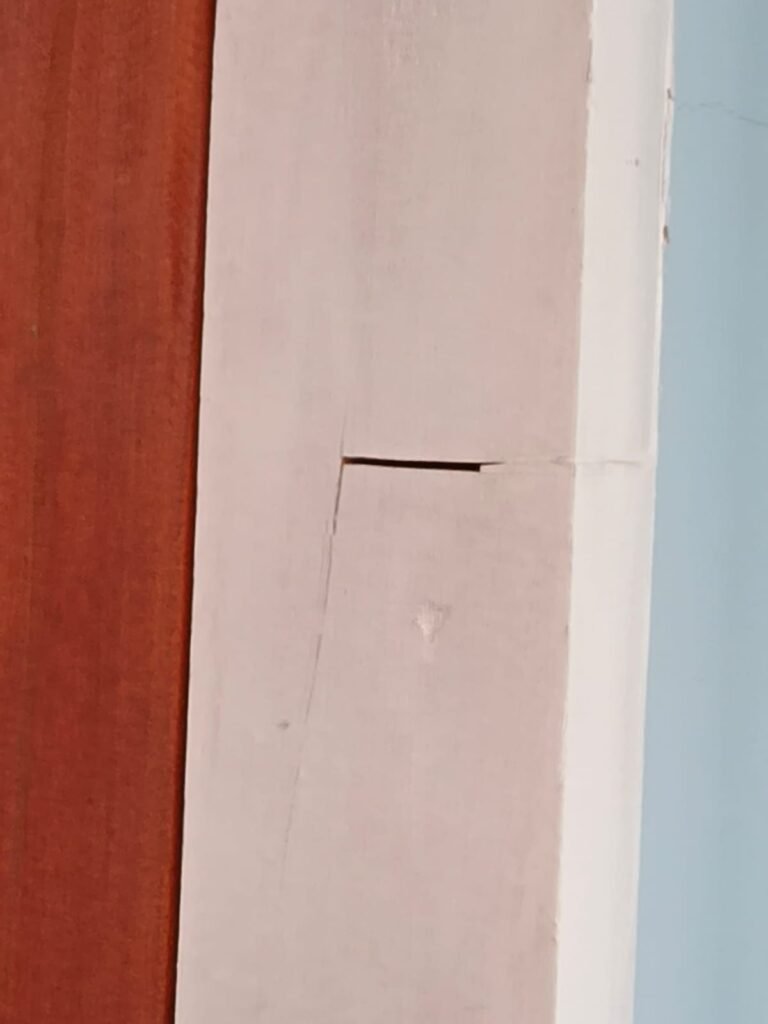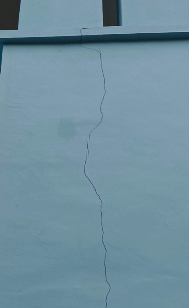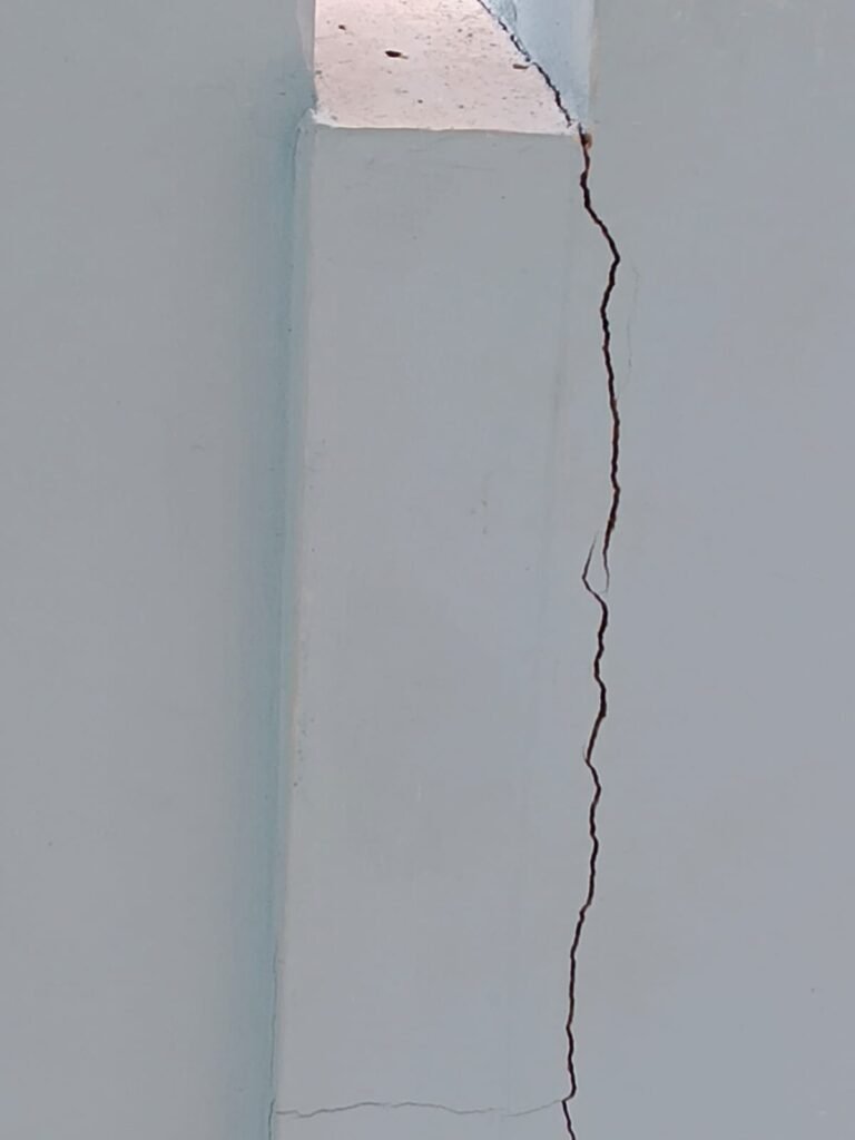 Masalah tidak berhenti pada tahap konstruksi. Pada tahap finishing, bangunan yang baru diresmikan dilaporkan sudah mengalami keretakan di sejumlah titik. Retakan ditemukan pada tiang lantai dua, dinding, hingga sudut jendela. Bahkan, tiang lantai satu di bagian depan kantor juga terlihat retak, mengindikasikan dugaan penurunan kualitas struktur sejak awal.