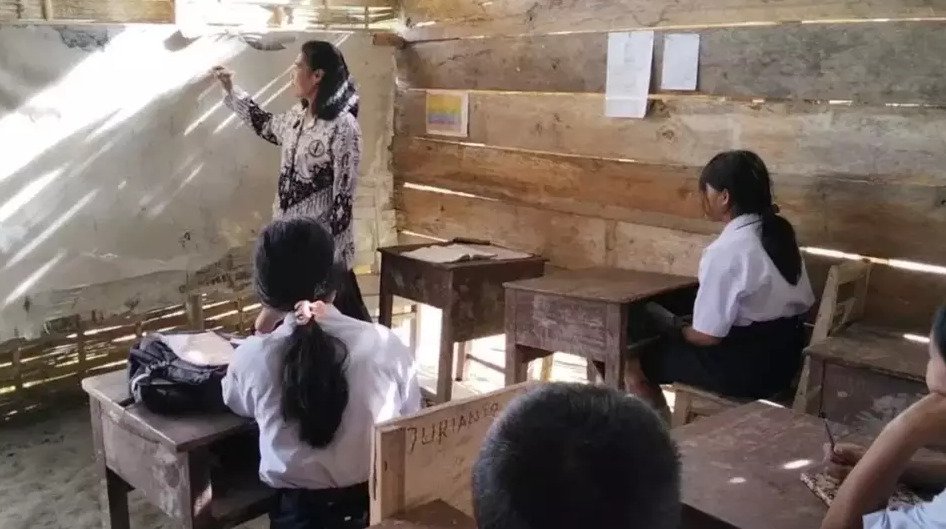 Meja kursi dibuat manual, papan tulis dari tripleks, dan peralatan belajar seadanya, inilah realita ketimpangan pendidikan antara kota dan pedalaman.