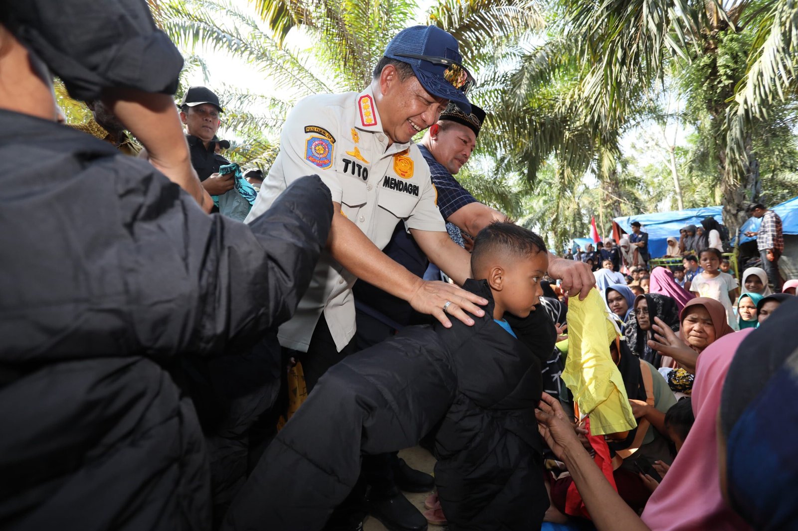 Dalam kunjungan itu, Tito turut menyerahkan bantuan kepada warga terdampak, berupa perlengkapan ibadah seperti mukena, sajadah, sarung, dan Al-Qur’an dari Presiden Prabowo Subianto, serta ribuan pakaian dan perlengkapan lain untuk anak-anak maupun orang dewasa. “Kami datang ke sini juga membawa sekadar oleh-oleh bantuan… yang mudah-mudahan bisa membantu Bapak-Bapak dan Ibu-Ibu, adik-adik semua di sini,” imbuhnya.
