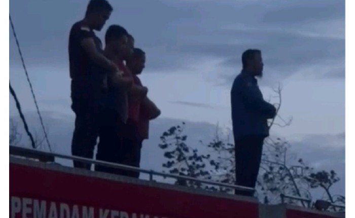 Api terlihat membara saat petugas berjibaku mengendalikan kobaran. Di tengah proses tersebut, personel Damkar tetap membagi tugas. Sebagian fokus memadamkan api, sementara lainnya bergantian melaksanakan kewajiban ibadah (shalat) di atap mobil, tanpa mengganggu jalannya operasi.