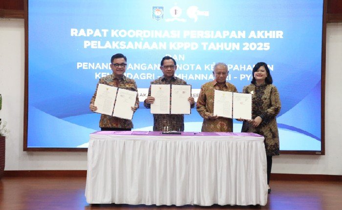 Mendagri, Muhammad Tito Karnavian bersama Gubernur Lemhannas RI, Ace Hasan Syadzily dan Ketua Dewan Pembina Purnomo Yusgiantoro Center (PYC) Purnomo Yusgiantoro menandatangani Nota Kesepahaman pelaksanaan Kursus Pemantapan Pimpinan Daerah (KPPD) Tahun 2025, Jumat (24/10/2025).