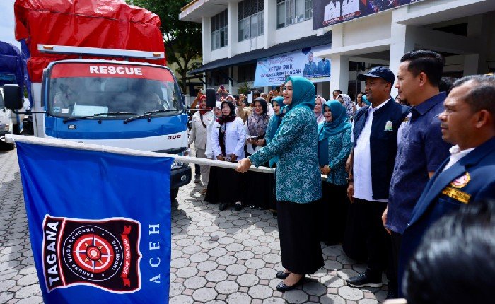BANDA ACEH – Ketua TP PKK Aceh, Marlina Muzakir, ( Kak Na ) melepas truk bantuan masa panik untuk korban banjir di Aceh Jaya, Aceh Barat, dan Nagan Raya, Rabu (22/10/2025), di halaman Dinas Sosial Aceh. Acara dihadiri PIA DPR Aceh dan anggota DPRA.