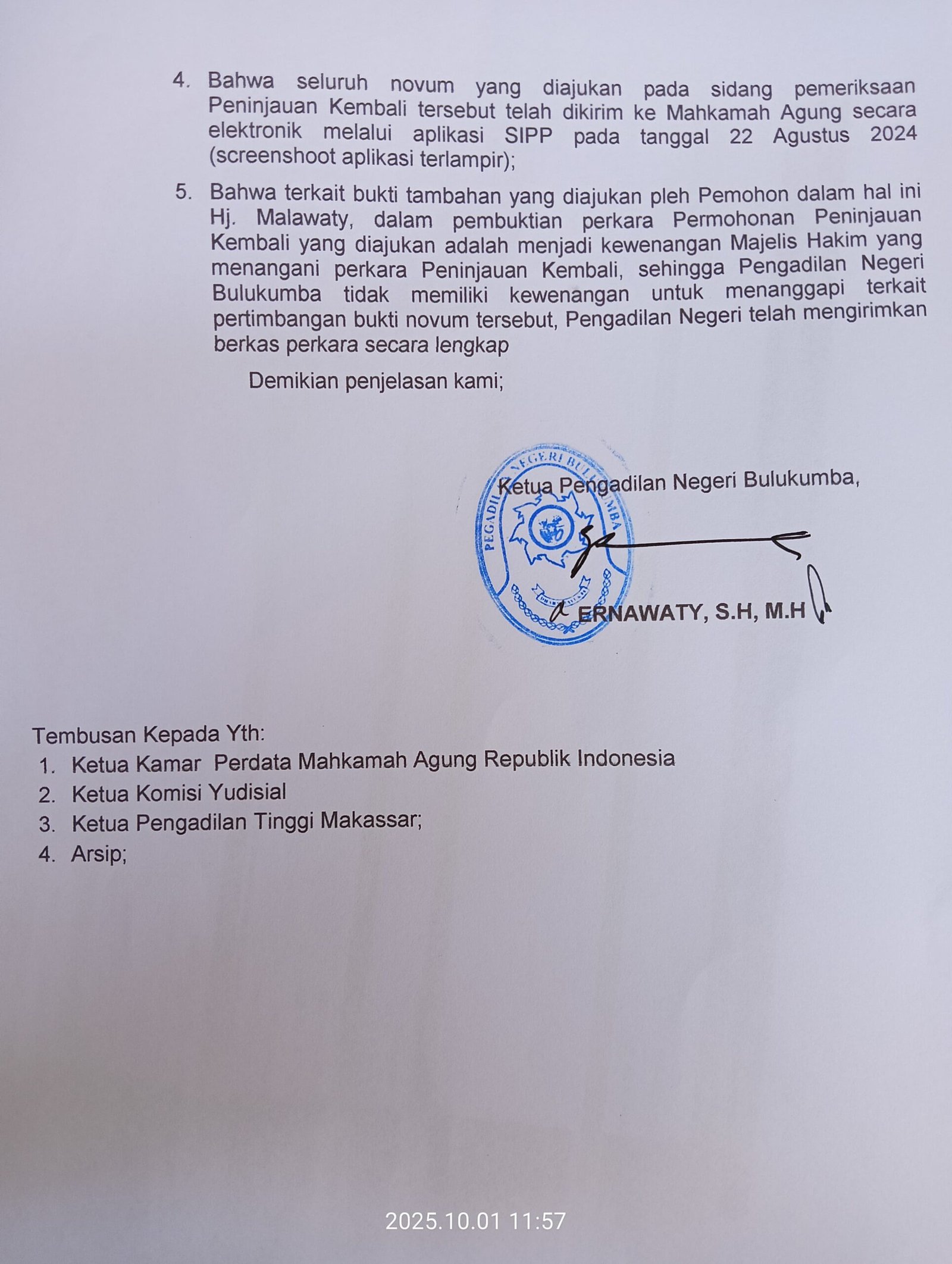 Terkait hilangnya bukti tambahan pada pengajuan PK, Pengadilan Negeri Bulukumba melalui Ketua PN Bulukumba, Ernawati, menyatakan dalam Surat Nomor 2060.a/KPN.W22-U11/HK2.4/IX/2025, bahwa bukti tambahan adalah kewenangan majelis hakim yang menangani PK. “Pengadilan Negeri Bulukumba tidak memiliki kewenangan menanggapi bukti Novum, karena berkas perkara PK telah dikirim secara lengkap,” ujar Ernawati.