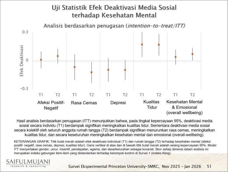 JAKARTA,– Penelitian Princeton University bersama Saiful Mujani Research and Consulting (SMRC) menemukan media sosial berdampak buruk terhadap kesehatan mental. Penghentian penggunaan media sosial terbukti meningkatkan kondisi mental pengguna.