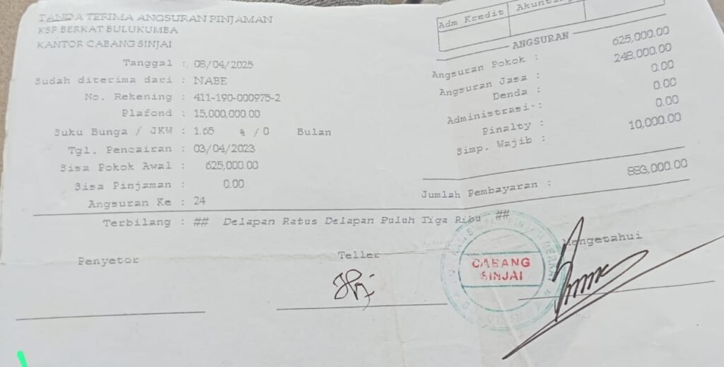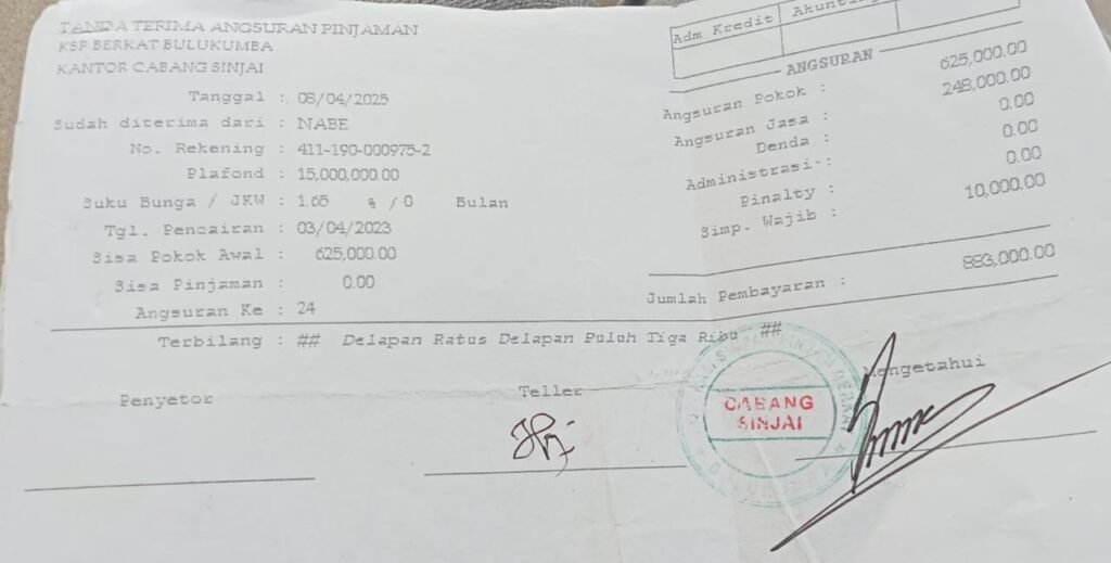 Pada Senin (1/12/2025), Koperasi Berkat Sinjai melalui pegawainya, SR, menyatakan bahwa pembayaran kredit telah dilakukan sesuai kwitansi selama 24 bulan.