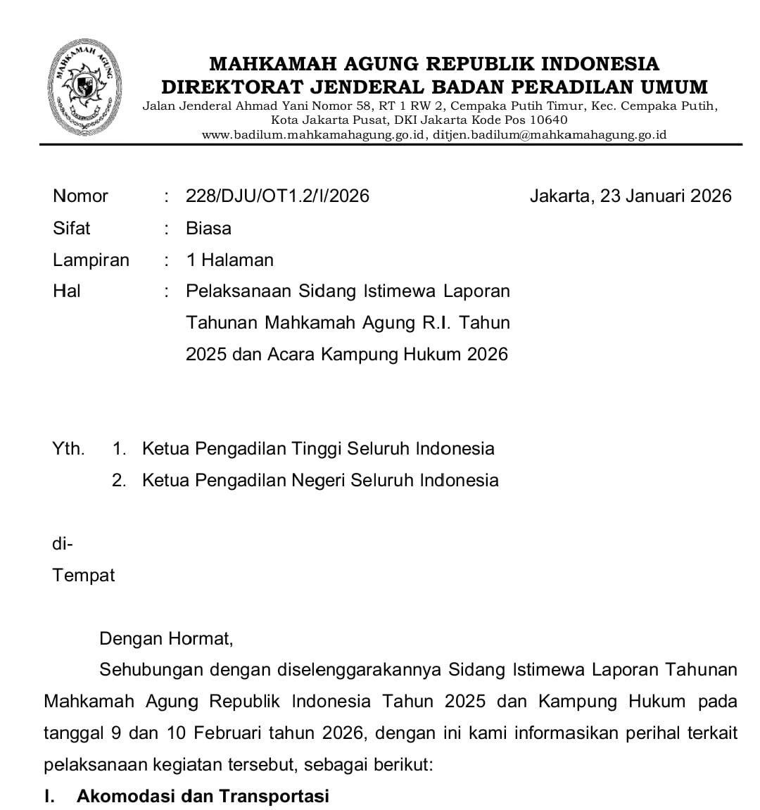 Direktorat Jenderal Badan Peradilan Umum (Ditjen Badilum) mengirimkan surat resmi kepada Ketua Pengadilan Tinggi (KPT) dan Ketua Pengadilan Negeri (KPN) di seluruh Indonesia mengenai akomodasi, transportasi, dan atribut toga. Surat dimaksud dikeluarkan pada Jumat (23/1).
