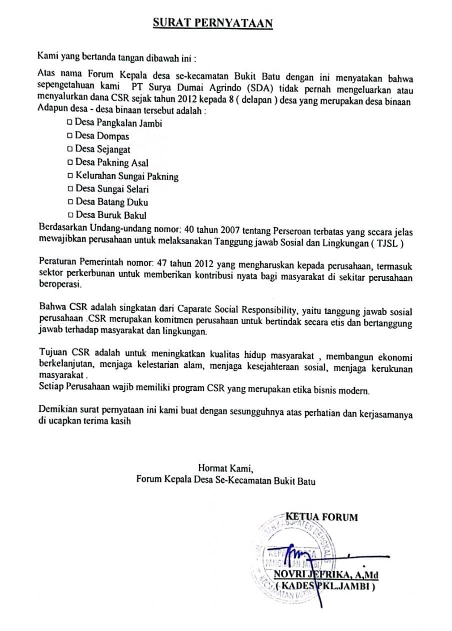 Kekecewaan masyarakat disampaikan secara resmi oleh Forum Kepala Desa se-Kecamatan Bukit Batu melalui surat pernyataan yang ditandatangani Ketua Forum, Novri Jefrika, yang juga menjabat sebagai Kepala Desa Pangkalan Jambi.