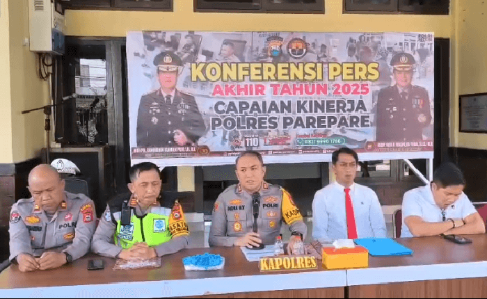 PAREPARE, INSERTRAKYAT.com — KepolisianResor (Polres) Parepare mencatat dinamika kamtibmas yang fluktuatif sepanjang tahun 2025. Data resmi yang dikemukakan dalam konferensi pers akhir tahun di Mapolres Parepare, Senin (29/12/2025), menunjukkan peningkatan jumlah laporan kriminal, diikuti penurunan tingkat penyelesaian perkara, sementara pada sektor lalu lintas terjadi perbaikan signifikan dalam angka kecelakaan.