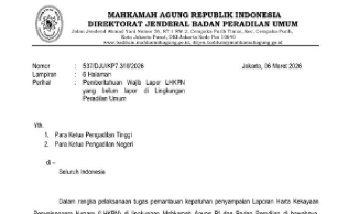 “Wajib lapor diberikan waktu 14 hari sejak pemberitahuan diterima untuk melakukan perbaikan sesuai Pasal 10A ayat (2) Peraturan KPK Nomor 3 Tahun 2024,” demikian bunyi surat resmi Badilum MA yang dlihat InsertRakuat.com, pada Sabtu (7/3/2026). Surat dikeluarkan sejak 6 Maret.